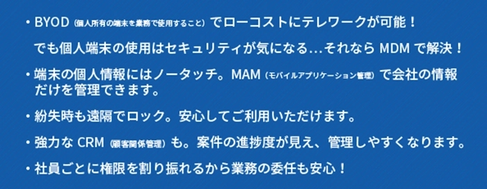 当社取り扱いリモートワークツールはMDMの効果を期待できます。ただしもともと個人所有の端末にはかけられる限界値がありますので会社でご準備いただくのがスムーズに適用できます。